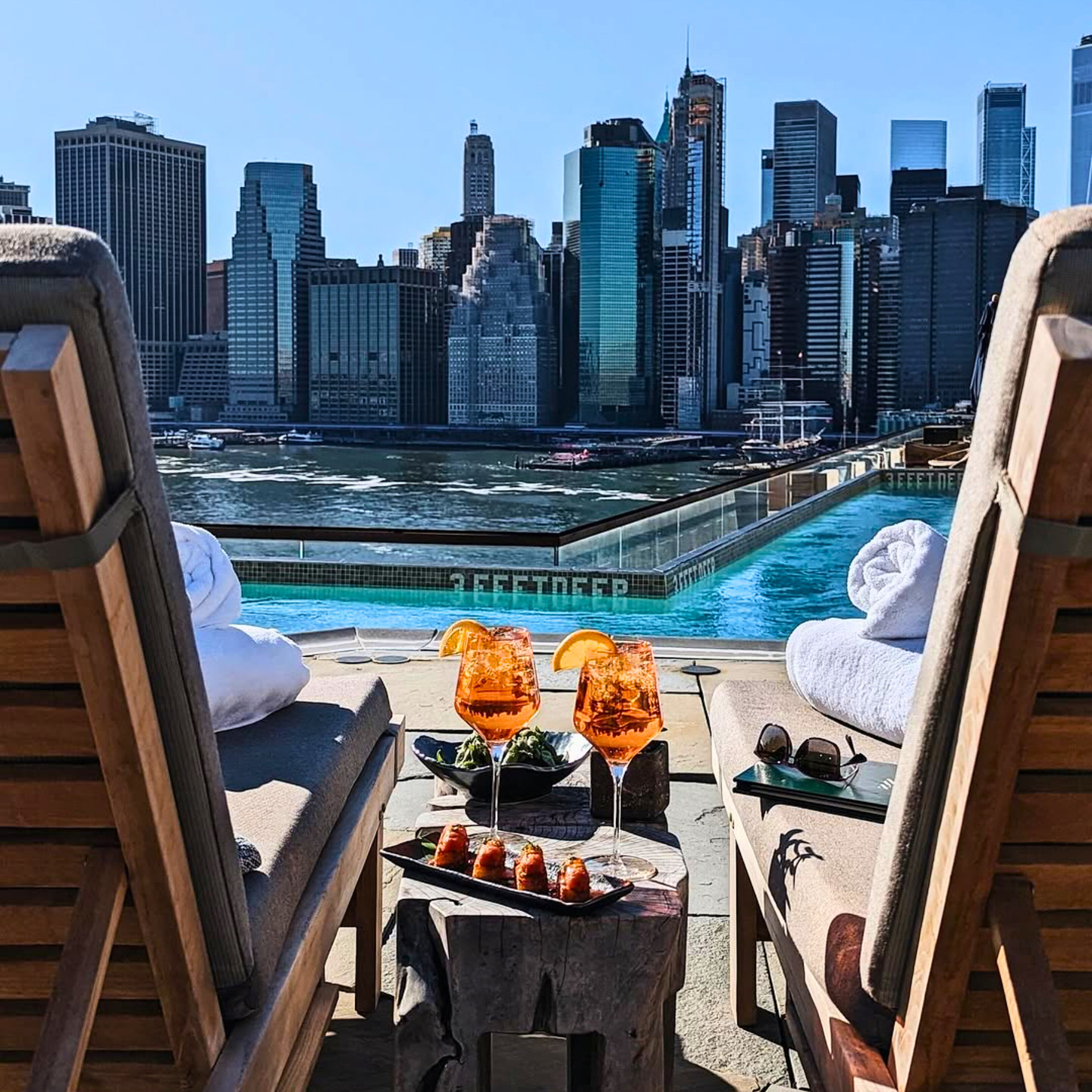 Set against the East River, these pools trade rooftop spectacle for cinematic serenity. Whether you’re floating beneath the Brooklyn Bridge or sipping cocktails at sunset, the views here stretch wider, and the energy, calmer.