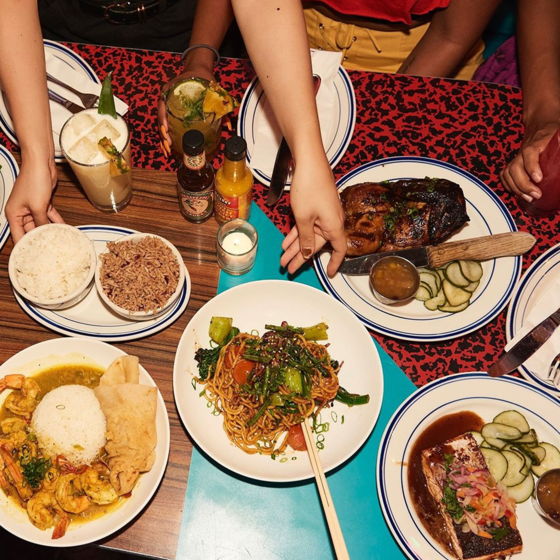 We recommend starting your culinary journey with the Ackee & Saltfish Stuffed Plantain Cups and Curry Rock Shrimp Tempura. Move on to the Yardie Shrimp Flatbread, Wah Gwaan Flatbread, and the Oxtail Flatbread for an explosion of flavors. For main courses, you can not go wrong with the NY Pork Chop, Tomahawk Steak, Red Snapper, or Braised Oxtail. To round off your meal, indulge in the Rum Raisin Bread Pudding or Baileys Cheesecake.