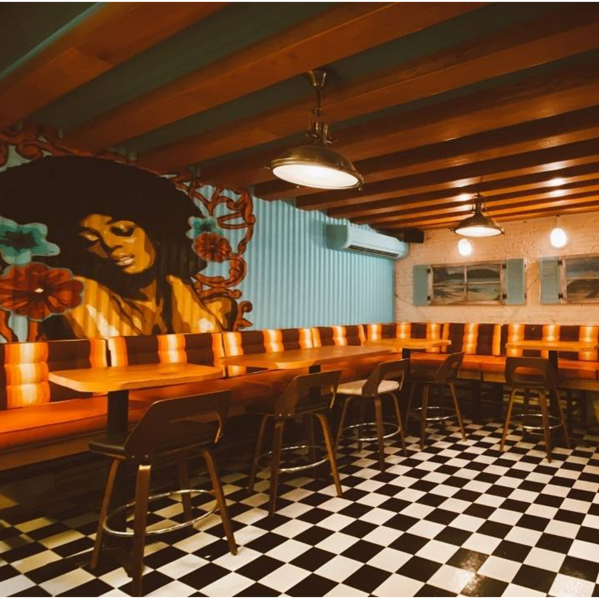 Omar’s Kitchen and Rum Bar is a vibrant, lively spot in New York City’s Lower East Side. It captures the essence of Jamaica’s dancehall scene with its colorful hand-lettered art, murals, neon signs, and upcycled packaging from Wray & Nephew and Appleton Estate.