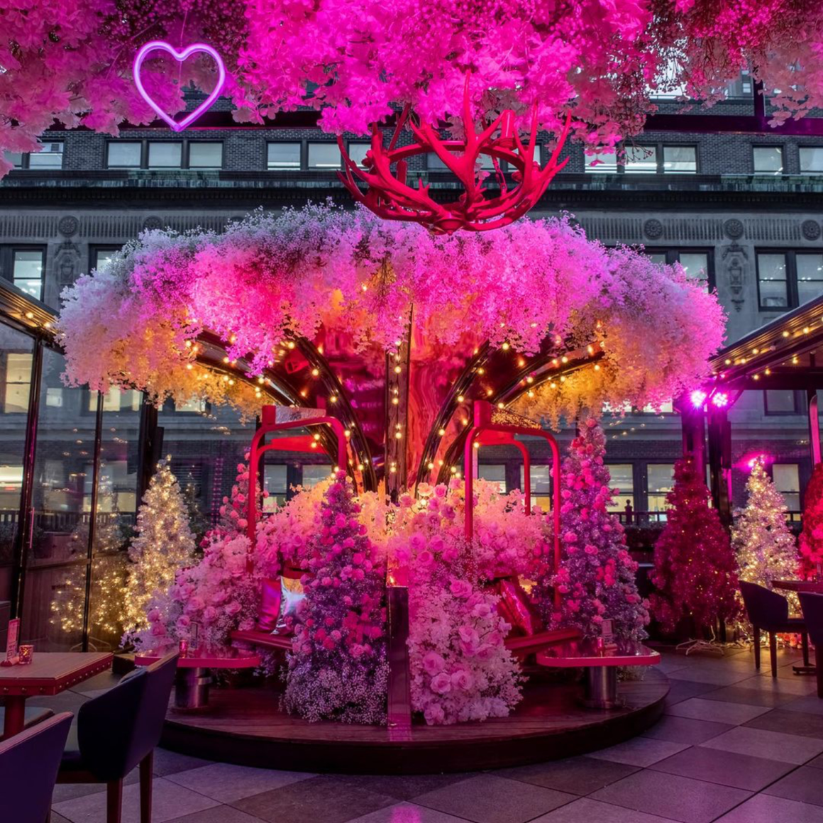 Experience the enchantment of Magic Hour Rooftop at Moxy Times Square as it transforms into a vibrant winter lodge with the Neon Frost Edition, a perfect Christmas wonderland. Positioned 18 stories above Manhattan, this rooftop offers an exceptional view enhanced by pink trees, neon walls, and festive pink cocktails. The ski lodge-themed rooftop, featuring a metallic carousel, is an Instagrammer’s dream, making it a must-visit for those in search of a unique holiday experience.